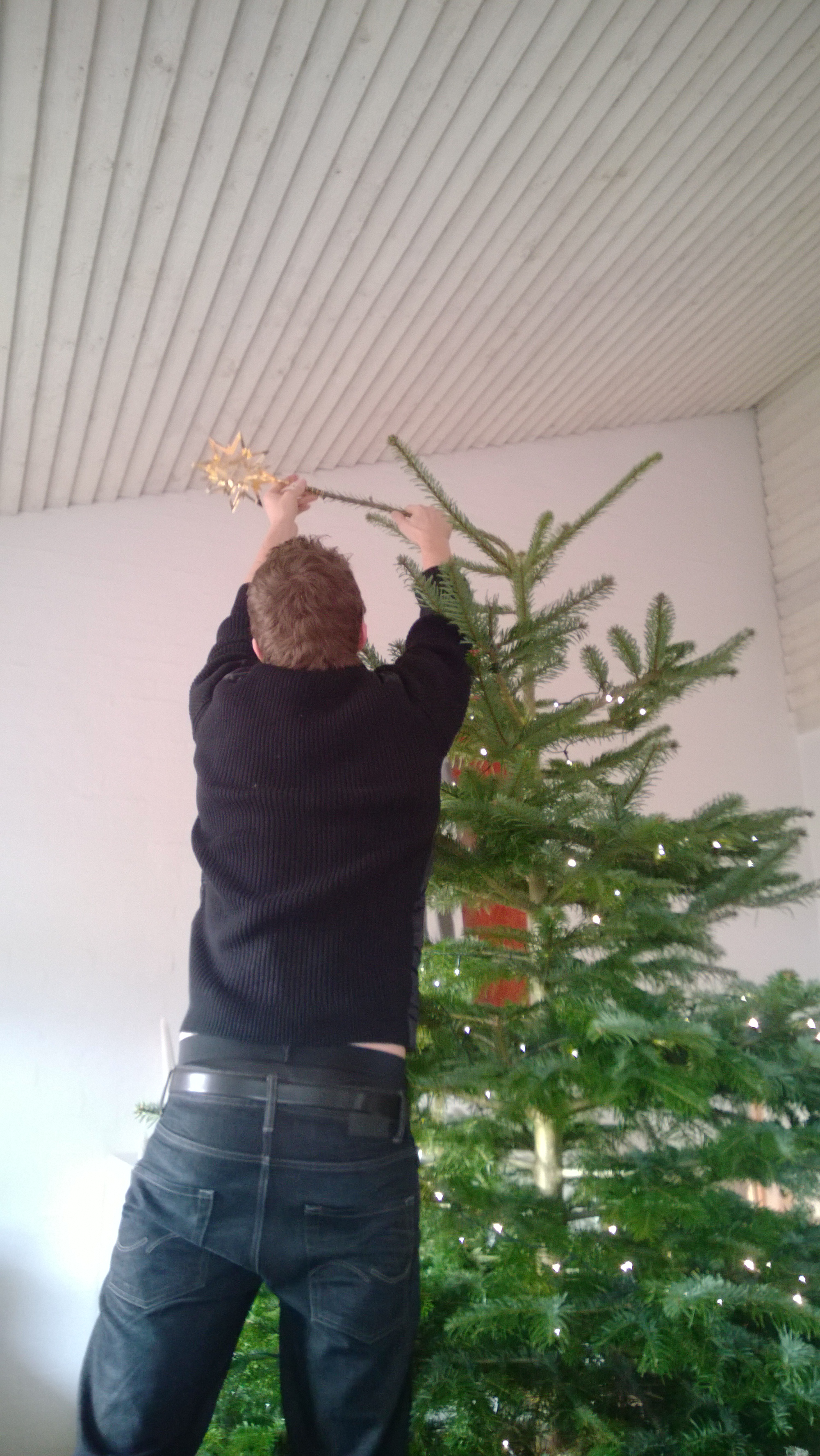 Decorating the Christmas tree – of course the star needs to go on top!