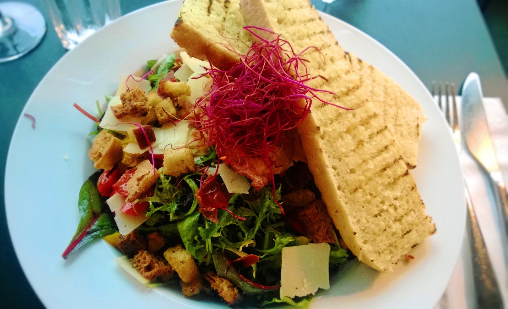 I chose the Caesar’s salad and a glass of white wine, while the viking went for the Club Sandwich (even though there was a burger option!).