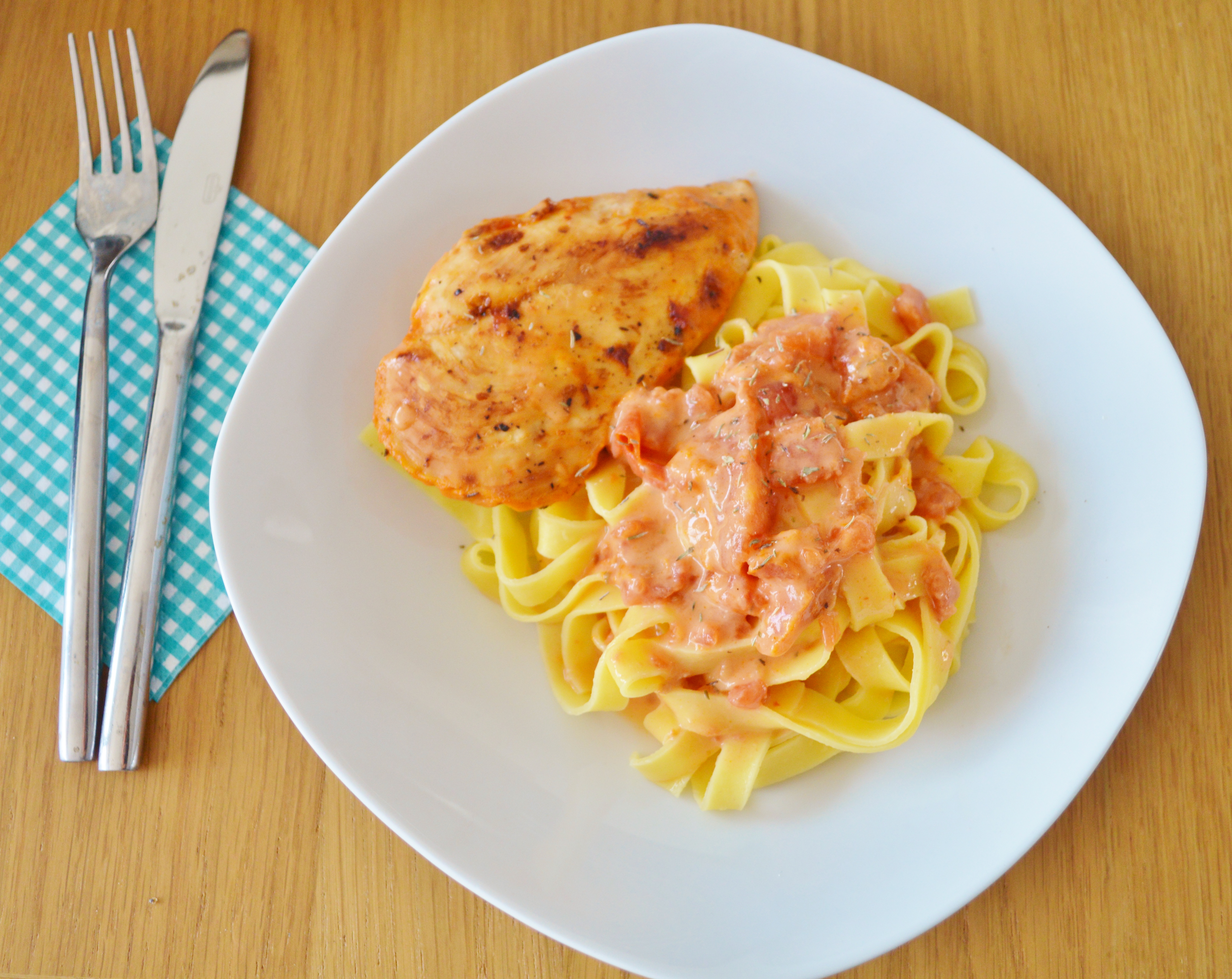 Don’t you know that feeling when you’re just hungry after work and don’t know what to make for dinner? It’s tempting to just order a pizza or other take-out, but really you’d like something good? Well, look no further. This is a recipe my mom once found somewhere and adapted it over the years, and it’s sooooo delicious! I’ve made this for guests, too, and people love it. Plus, it’s super simple to make! Just throw the ingredients together and pop it in the oven. It’s pan-fried chicken breasts in a creamy vermouth-tomato-sauce with thyme, but that was a bit too long to put in the title. Served over fresh tagliatelle, maybe with a green side salad – perfection.