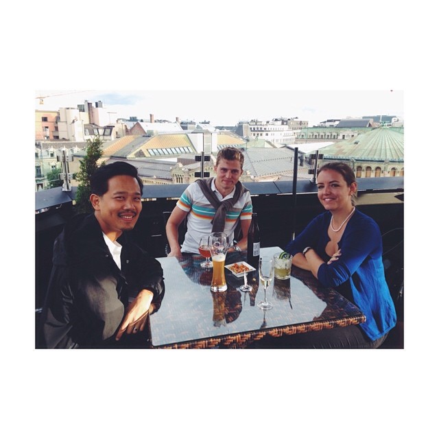 Luckily, the museum and the harbor were very close to our hotel, so we headed back to relax for a bit, before heading out again for some pre-dinner drinks. I’d made plans with Alina, a blogger friend of mine, and her husband, at the roof top terrace at the Grand Hotel (across the street from ours). It was great meeting her in person, as I’ve enjoyed her blog (Life in a Bubble) and her Instagram pictures over the past months, and we had a great time. They’re coming to Copenhagen soon, so hopefully we can return the favor. Here’s a very rare picture of the boyfriend (in the center) – he usually doesn’t let me put his photo on the blog, but made an exception (photo credit is to Alina).