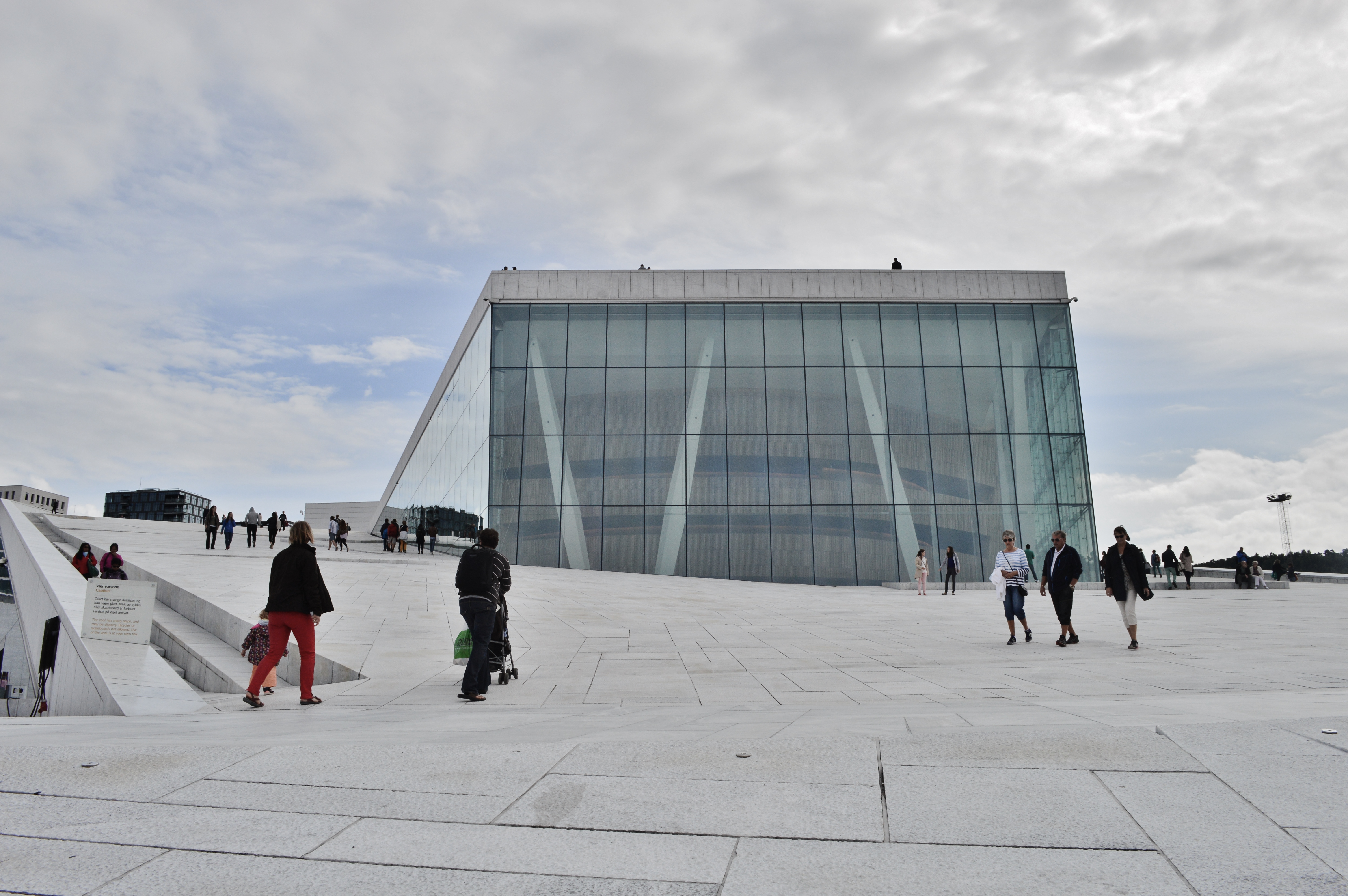 We strolled back down Karl Johans gate and to the opera house, which is located right at the waterfront. A very fascinating arcitectural structure, and a stark contrast to the otherwise very classic, old-timey Oslo building panorama. We climbed all the way onto the top (not that easy when you’re still not feeling 100%!) and enjoyed a nice view over the city center and up to the ski jumping hill Holmenkollen for about five seconds, before it started to rain, so we decided to head back.