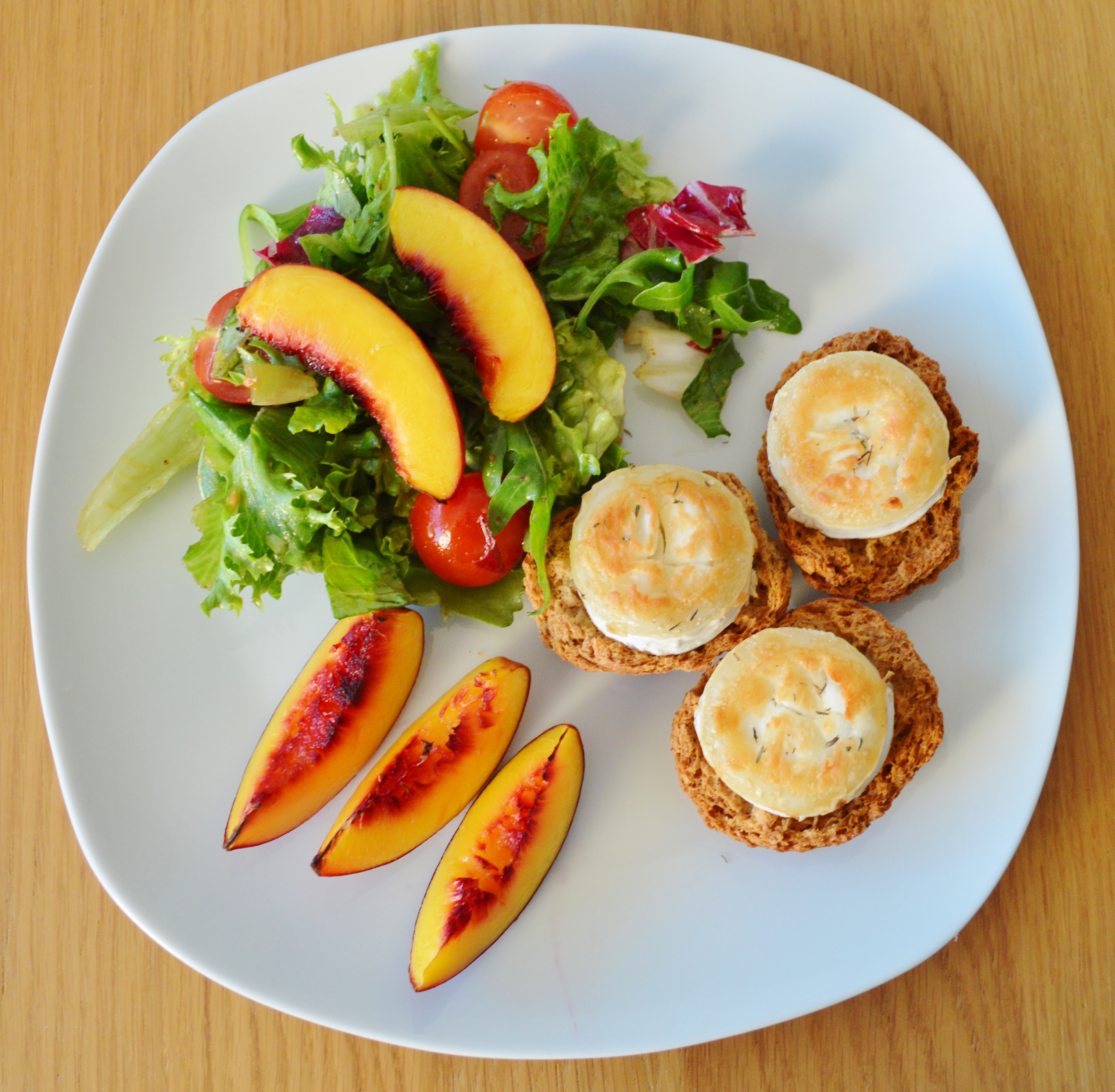 Oven-grilled goat cheese and nectarines on a green salad with a honey-mustard-lemon dressing