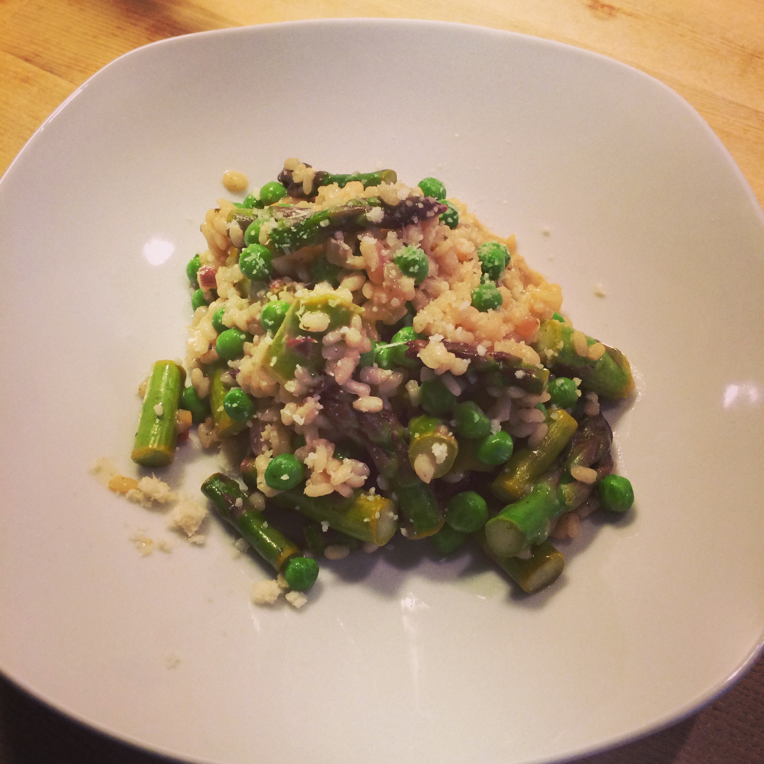Heat some olive oil or butter in a pan and fry onion dices until translucent. Add ristotto rice and let sear for a couple of seconds. It should not turn brown! Deglaze with the white wine and stir until the wine is almost absorbed. Heat the vegetable broth and slowly add more and more broth to the pan, so the rice is always just covered. Wash the asparagus and break off the stringy ends. Cut into 2-3cm pieces. In a second pan, heat about 1 tbsp olive oil and add the asparagus. Season with salt and squeeze the juice of a half lemon over the asparagus. Let cook for about 5 minutes, stirring frequently. When the risotto has absorbed most of the fluid, add the frozen peas (this will interrupt the cooking process, so make sure the rice is cooked all the way). Let cook another 5 minutes or so, until the peas are cooked. Stir in the parmesan cheese and finally the asparagus pieces. Add some freshly grated parmesan before serving. Enjoy!