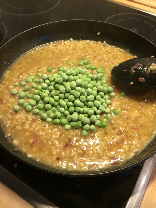 Adding the frozen peas